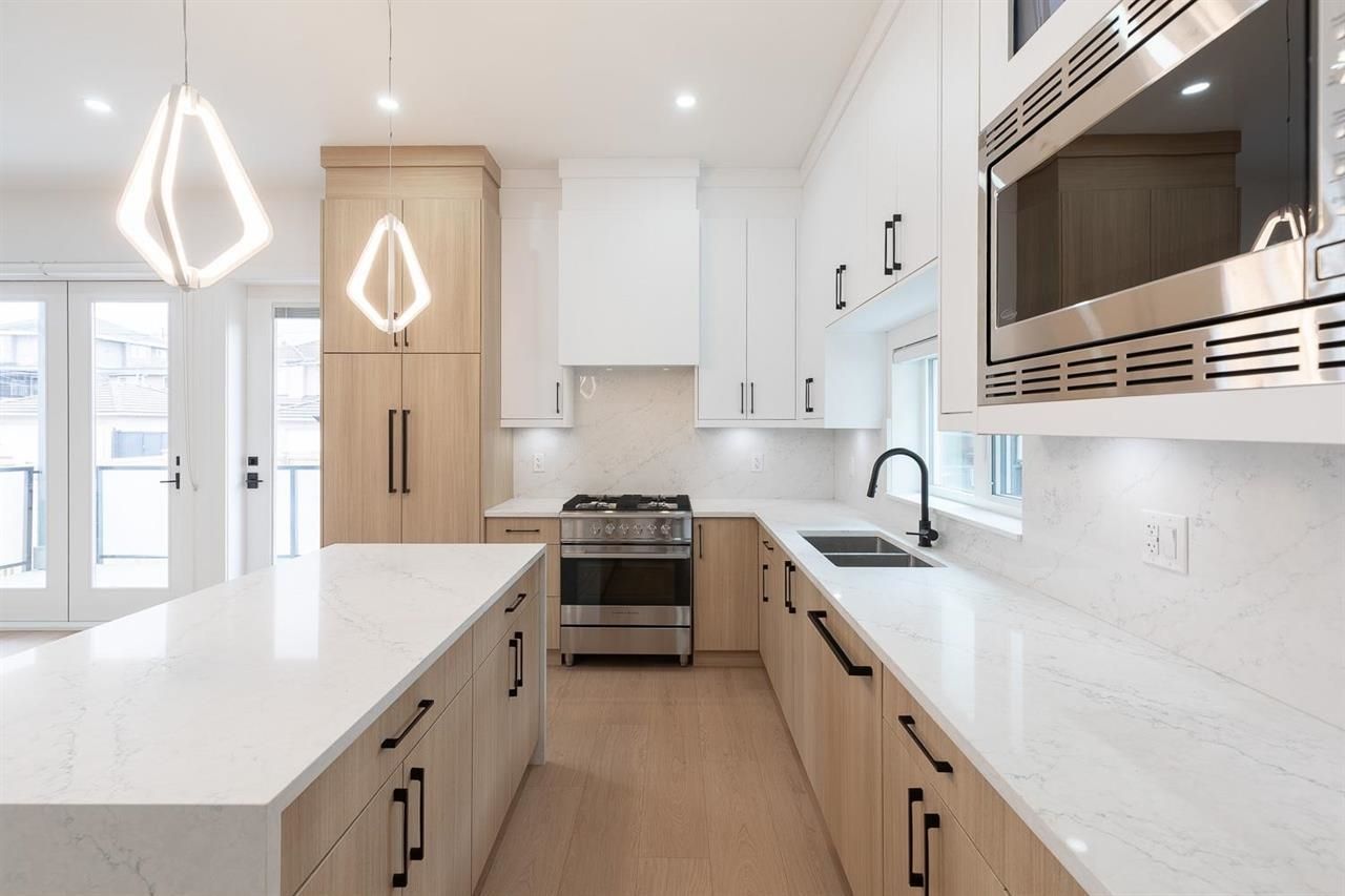 Brand New centrally located front and back 1/2 duplex (on a wider lot) features an open deck leading into the main floor which offers a functional living and dining area, powder room and kitchen with quartz countertops, Fisher & Paykel appliances. Quality finishes throughout this home. Upstairs has 3 bedrooms and 3 bathrooms plus a bonus room with a balcony on the third floor, that can be used as a rec room, office or extra bedroom. Comes with a single detached garage, and an additional parking pad. Close to parks, shopping, transit and schools.
